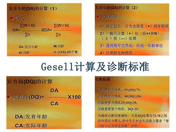 格賽爾(Gesell)智能診斷法適用于嬰幼兒。這種方法 從動作能、應(yīng)物能、言語能及應(yīng)人能4個方面進行檢查,并把4周、16周、28周、40周、52周、18個月、24個月、36個月作為8個“樞紐年齡”,即 在這些階段顯示出特殊飛躍進展。所測得的結(jié)果,以發(fā)育商數(shù)(DQ)來表示。